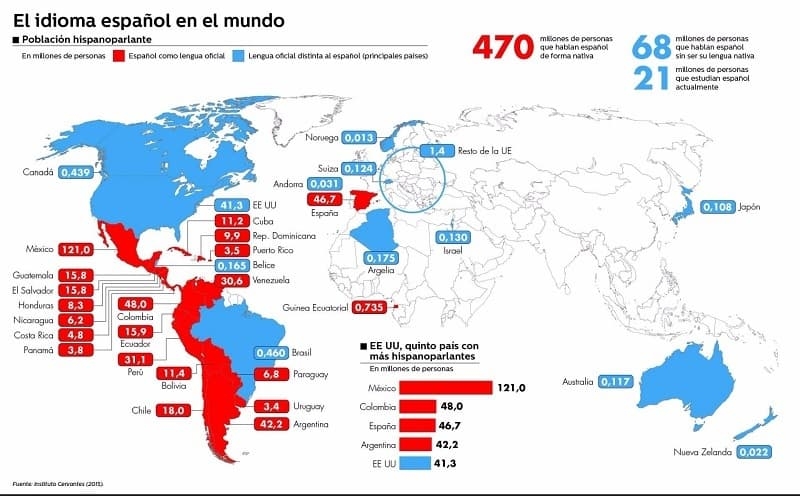 Mexico has the largest number of native speakers, followed by Colombia, Spain, and Argentina. The United States hosts one of the largest Spanish-speaking populations in the world, driven by immigration and multigenerational bilingual communities.