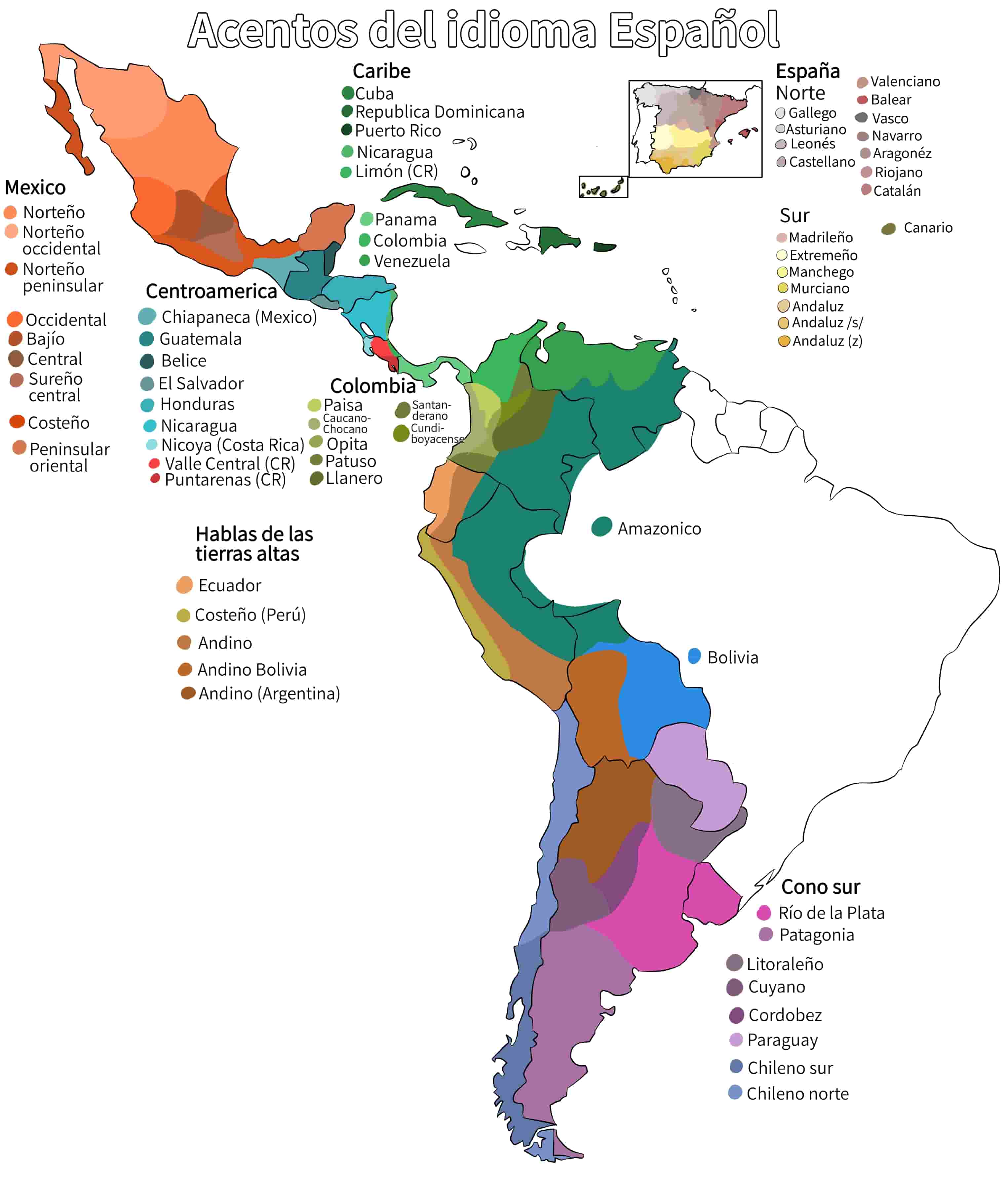 - Andean Spanish (Peru, Ecuador, Bolivia, parts of Colombia and northern Chile/Argentina): Clear articulation, influences from Quechua and Aymara in vocabulary and intonation, and robust use in education and administration.